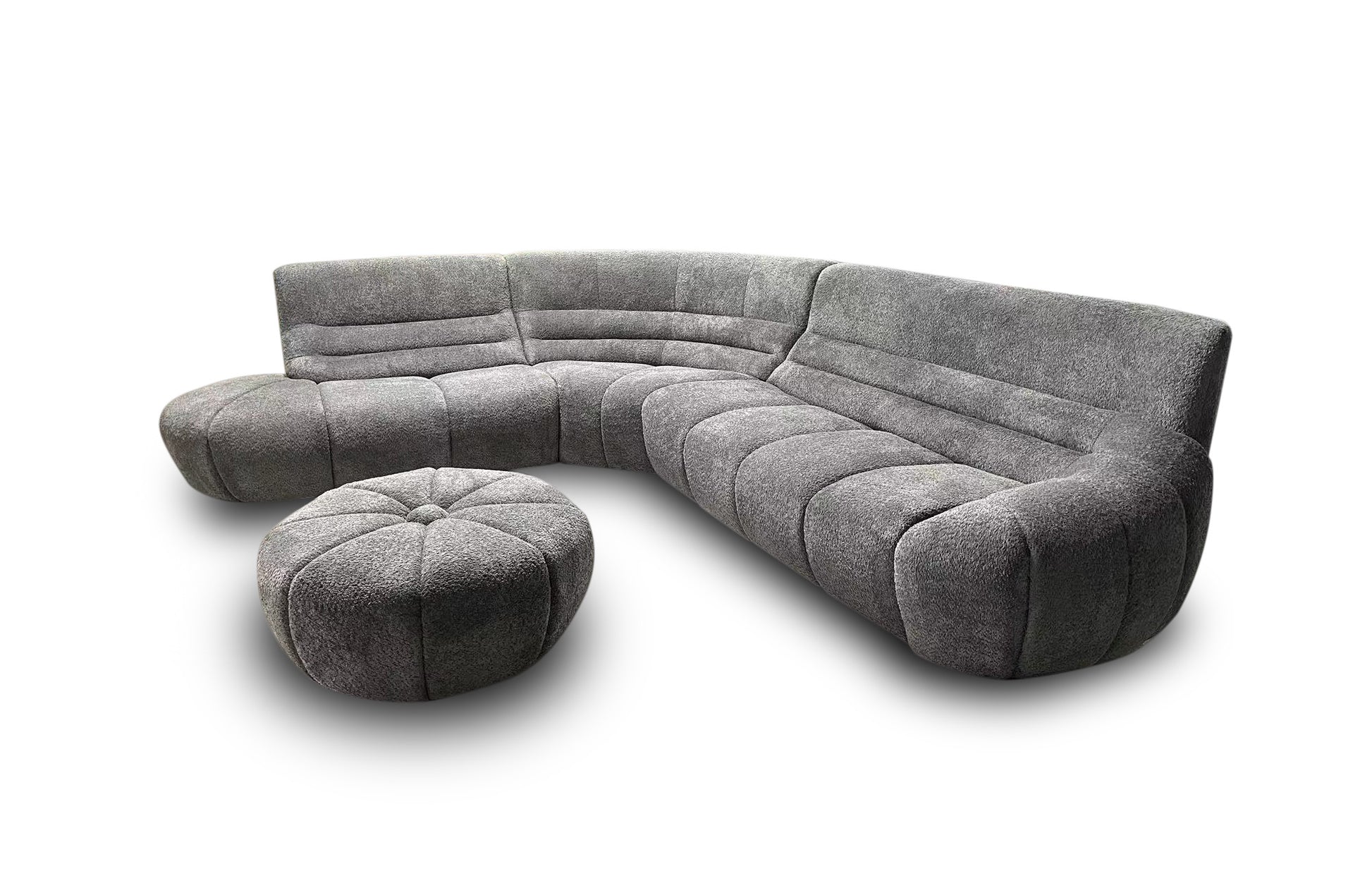 Introducing the Kenzo Sectional, a perfect blend of contemporary design and luxurious comfort. This stunning piece features a unique, sculpted silhouette with seamless curves and plush boucle gray fabric. The generously padded seats and backrests provide exceptional support and relaxation, making it ideal for lounging or entertaining. Its modular configuration offers versatile arrangement options to fit any living space, and the matching ottoman adds functionality and style. Elevate your home decor with the Kenzo Sectional, a statement piece that combines modern aesthetics with cozy comfort.