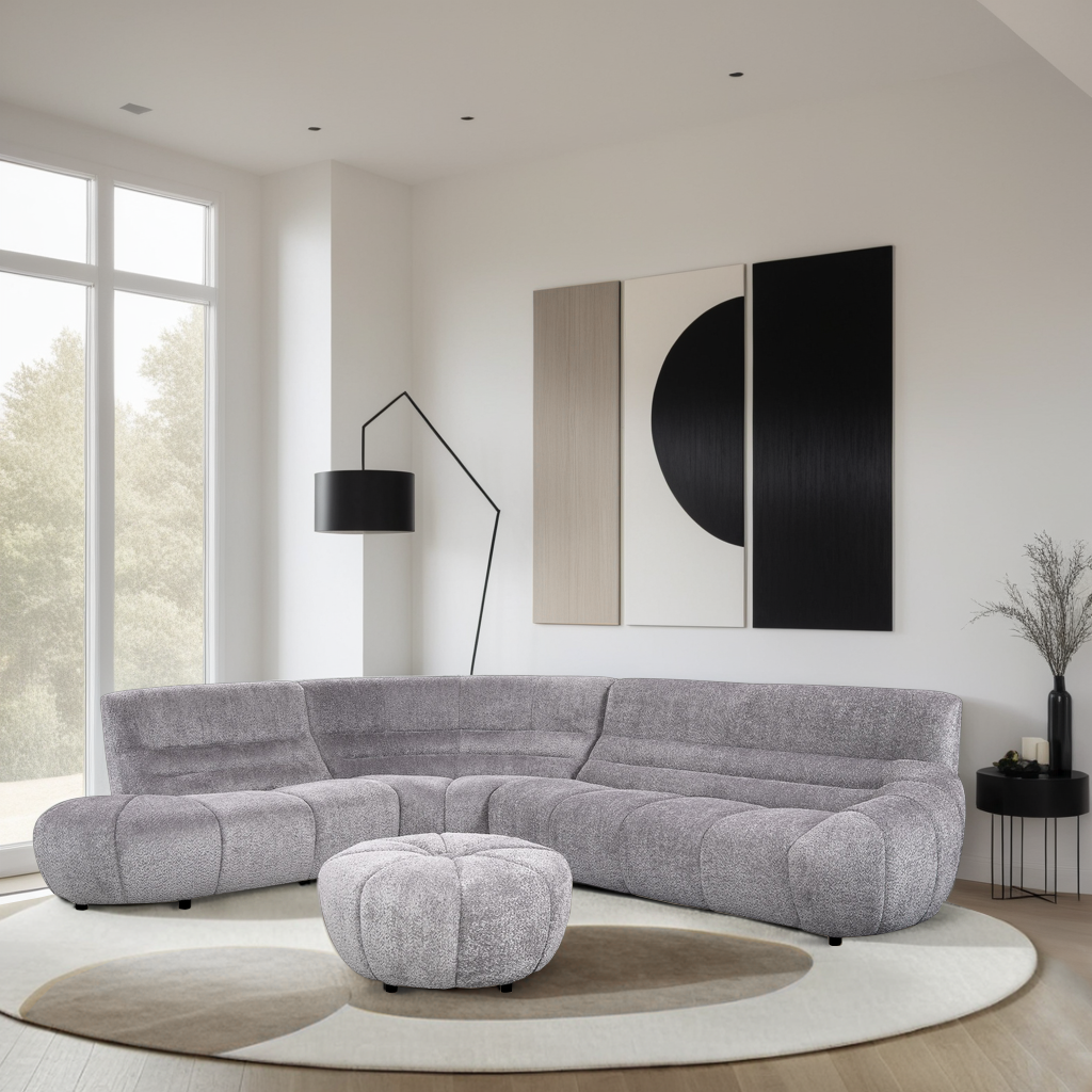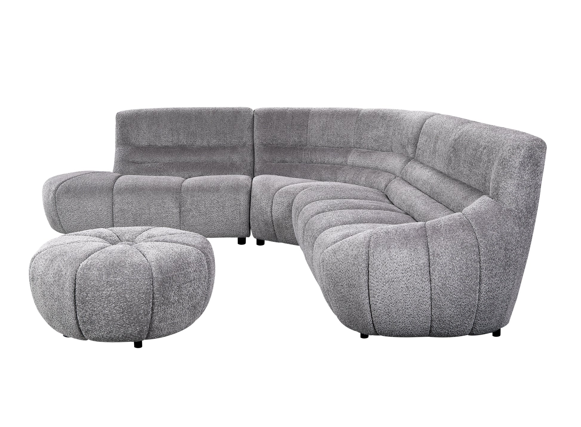 Introducing the Kenzo Sectional, a perfect blend of contemporary design and luxurious comfort. This stunning piece features a unique, sculpted silhouette with seamless curves and plush boucle gray fabric. The generously padded seats and backrests provide exceptional support and relaxation, making it ideal for lounging or entertaining. Its modular configuration offers versatile arrangement options to fit any living space, and the matching ottoman adds functionality and style. Elevate your home decor with the Kenzo Sectional, a statement piece that combines modern aesthetics with cozy comfort.