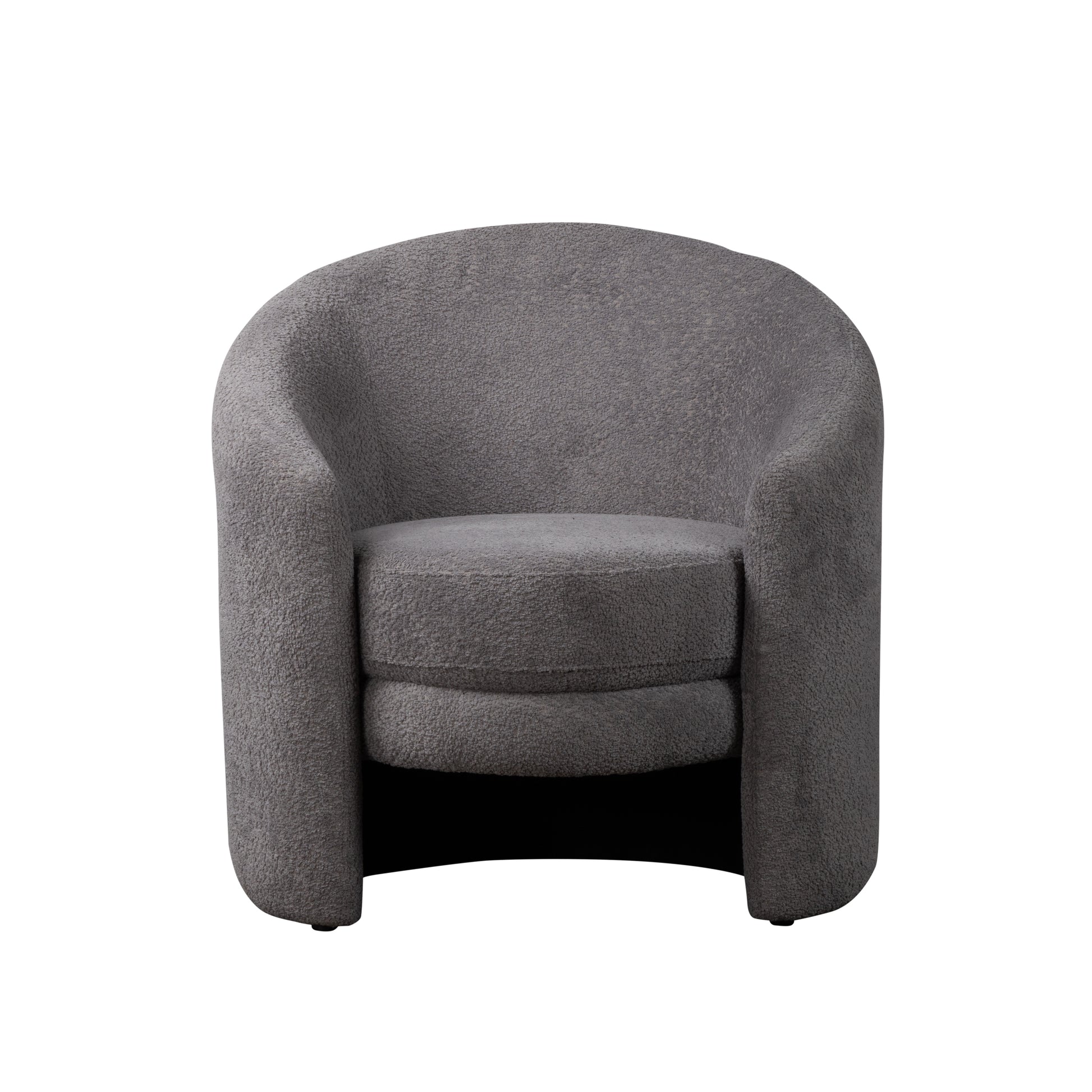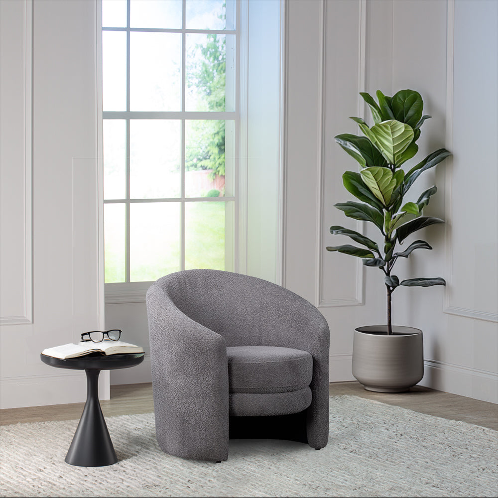 The Leo Accent Chair is covered in an elegant gray boucle fabric with a contemporary wrap around design. A great small space seating solution.