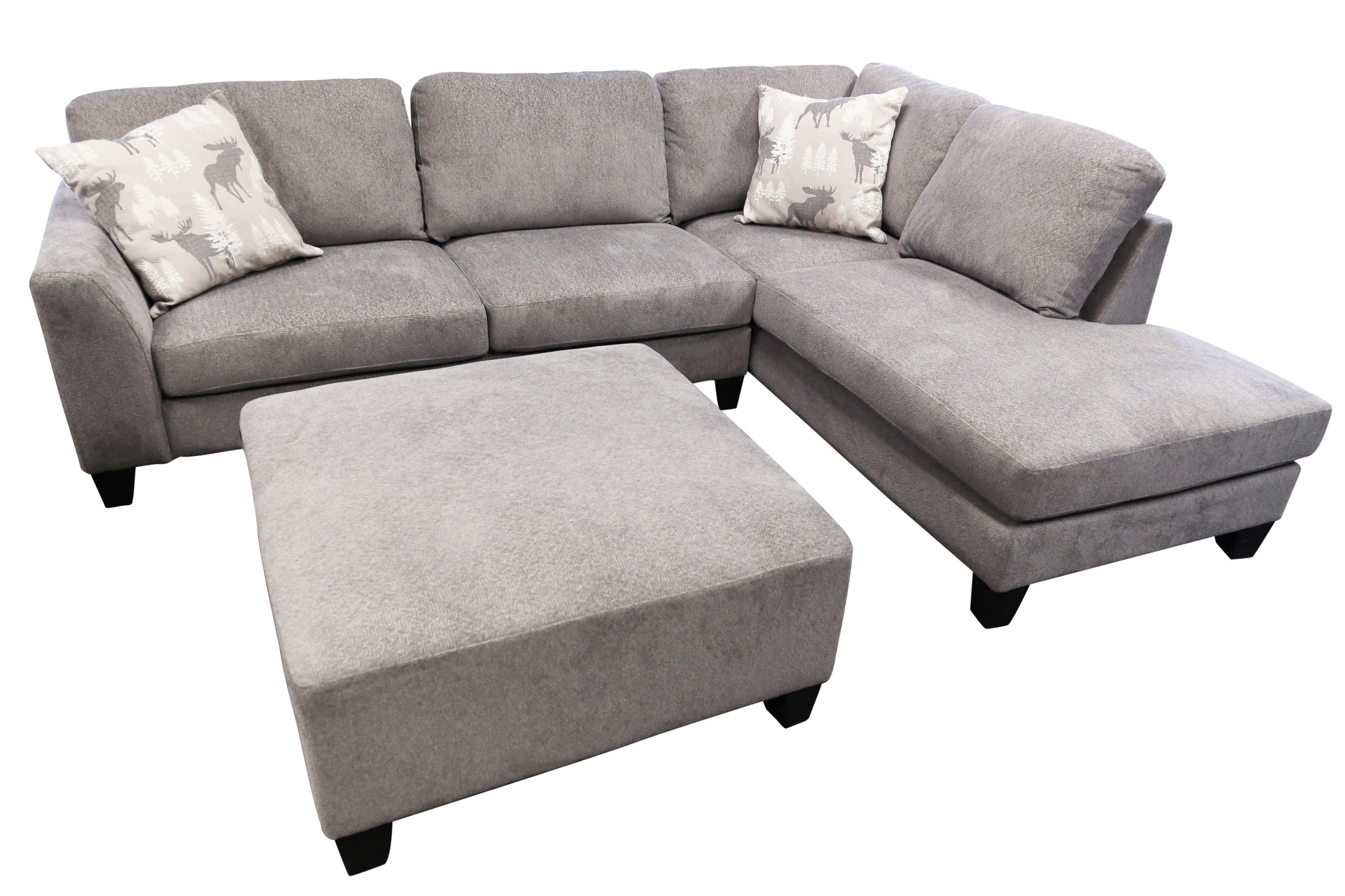 This wilderness inspired ottoman features moose and alpine silhouettes. Covered in an elegant gray and white fabric, this large square ottoman is a lodge style statement piece great for kicking up your feet on.